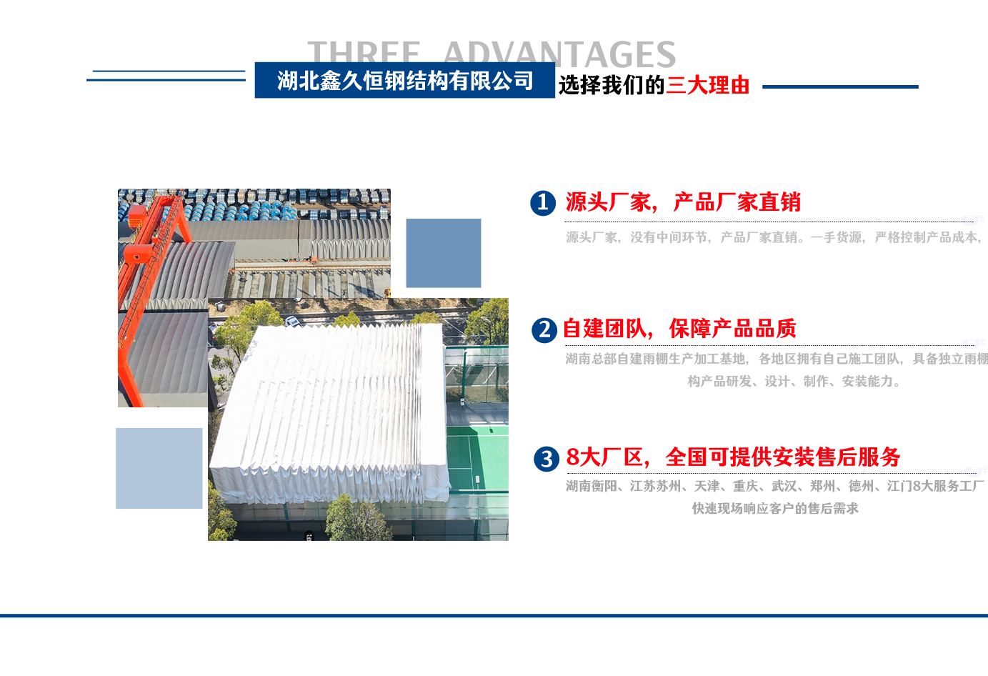 湖北鑫久恒鋼結構有限公司是一家電動雨棚、膜結構車棚研發,生產銷售,施工安裝于一體的專業鋼結構科技公司,主要產品有伸縮雨棚,電動雨棚,膜結構車棚等。 湖南地區職員目前有80多人,占地面積20000平方米,廠房面積15600平方米,配備先進的生產流水線,使每件品質產品的堅實基礎?! 」驹谔K州、天津、重慶、武漢、德州、烏魯木齊、江門均設有服務工廠,總人員共300多人,擁有專業的技術團隊,配備先進的設備和流水線生產,產能高,貨源充足,發貨速度快,服務區域廣?! ∫苿由炜s棚適用于通道臨時倉儲、戶外運動遮陽、污水池遮蓋、能源交通、熱力化工、礦山、船舶制造及市政建設、物流、碼頭等領域的構件制作加工,成品半成品存放、倉庫、野外儀器設備操作用房等。尤其是對工廠發貨、倉儲臨時遮雨防嗮,梅雨期較長、建設周期較短的工程施工等特別適用。還可根據用戶需求量身定制、適合企業所需不同款式的產品?! ∥夜緢猿帧罢\信社會為本,客戶滿意為榮”的經營理念,做到質量把控,嚴格管理,精益求精,恪守承諾。使鑫久恒逐步走向成熟,其系統化、專業化日趨完善。以專業的技術、科學的管理,更高的產品質量,優良的企業信譽,真誠的客戶服務,靈活多樣的經營方式和務實創新的企業精神愿與社會各界攜手合作,為推動智能鋼結構建筑事業的發展而不斷努力。...